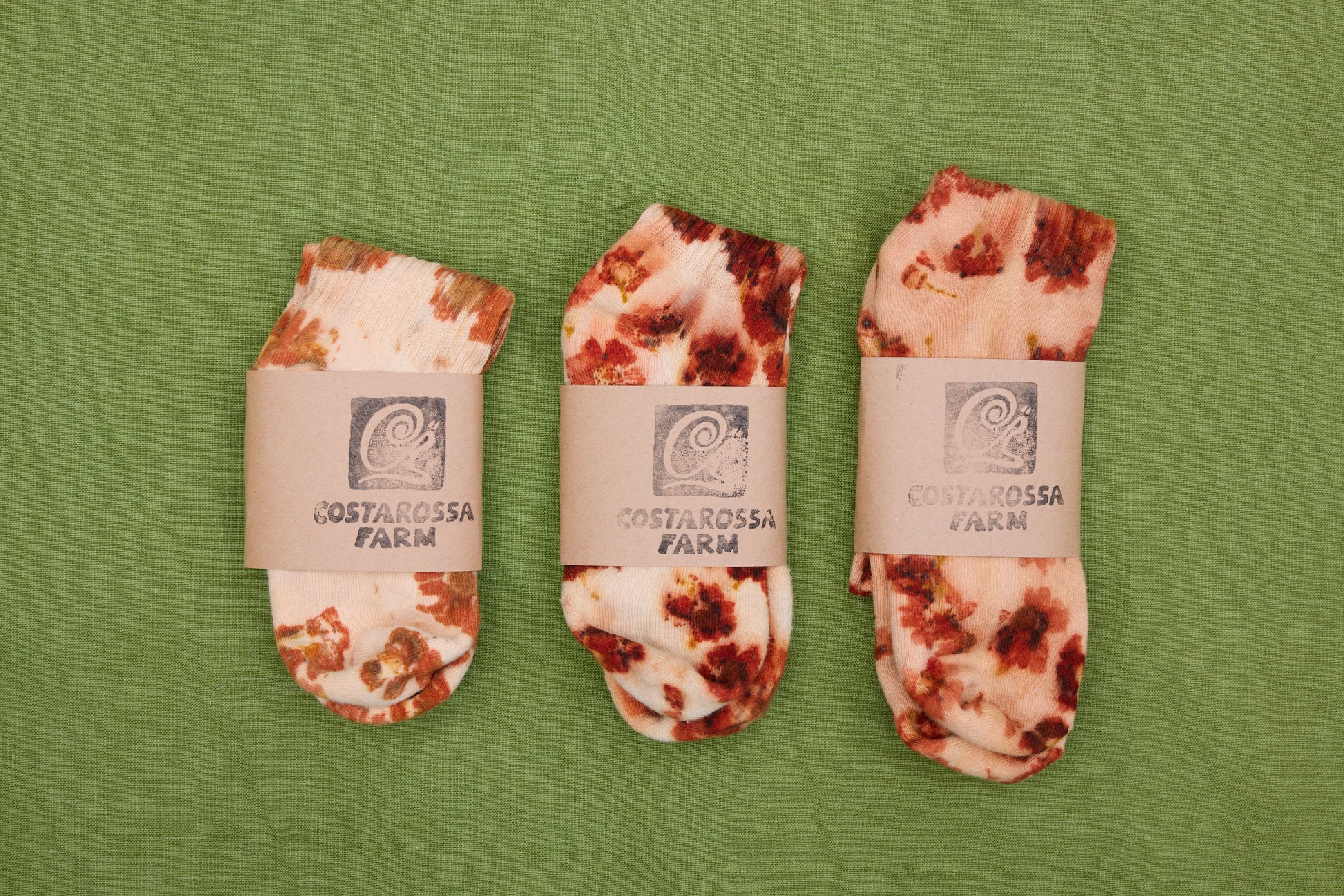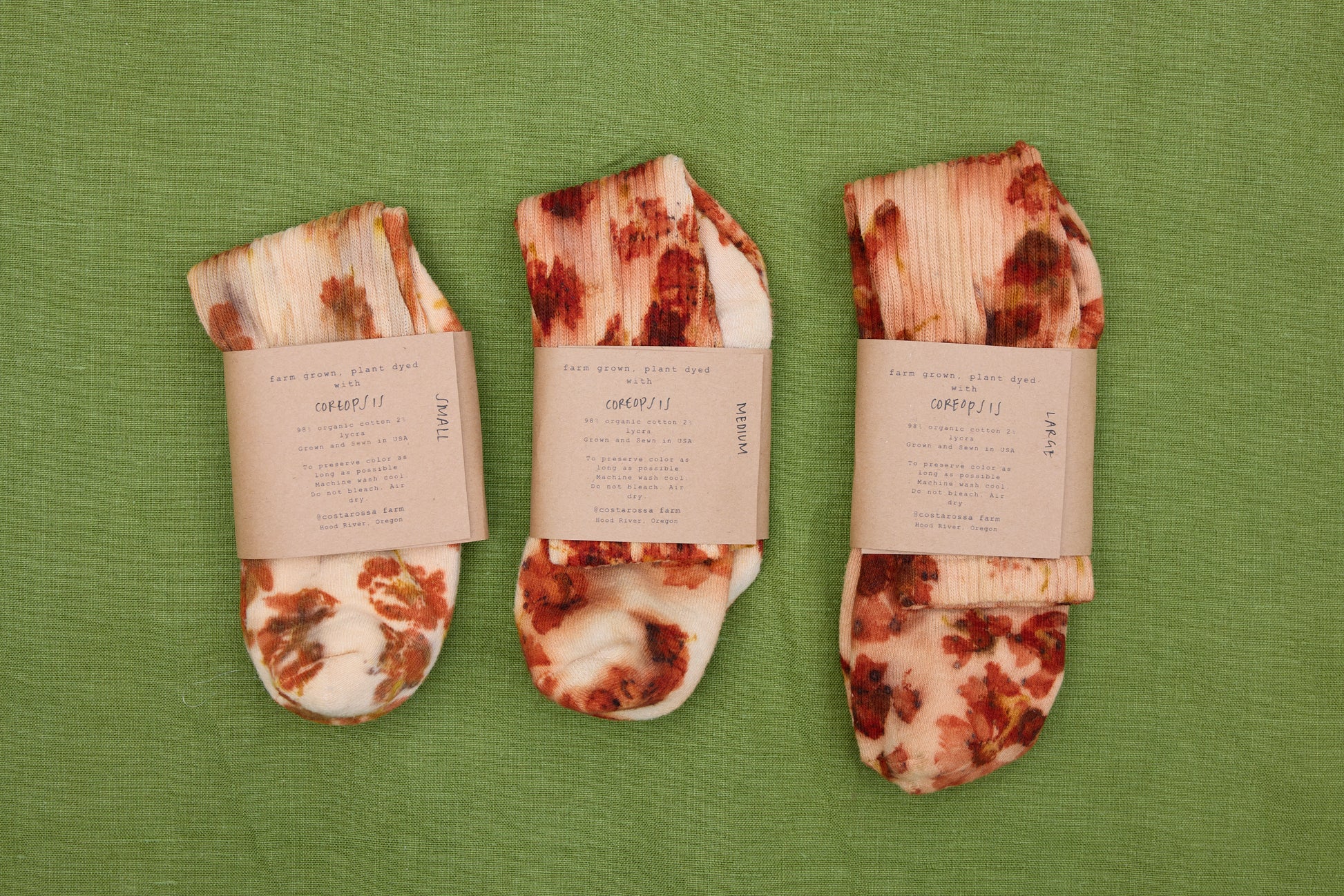Flower print socks dyed with Coreopsis flowers grown on our farm.